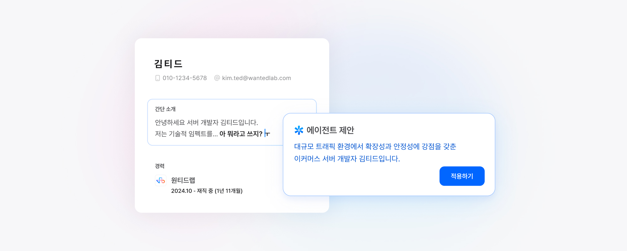 이력서는 첫인상을 결정하는 가장 중요한 문서죠. 하지만 많은 구직자들이 "내 이력서가 충분히 매력적인가?", "이 포지션에 맞게 작성된 걸까?"라는 고민에 빠지곤 합니다. 원티드는 이런 구직자들의 고민을 해결할 수 있는 방안을 생각했어요. 그리고 원티드 에이전트로 새로운 기능을 개발했죠!