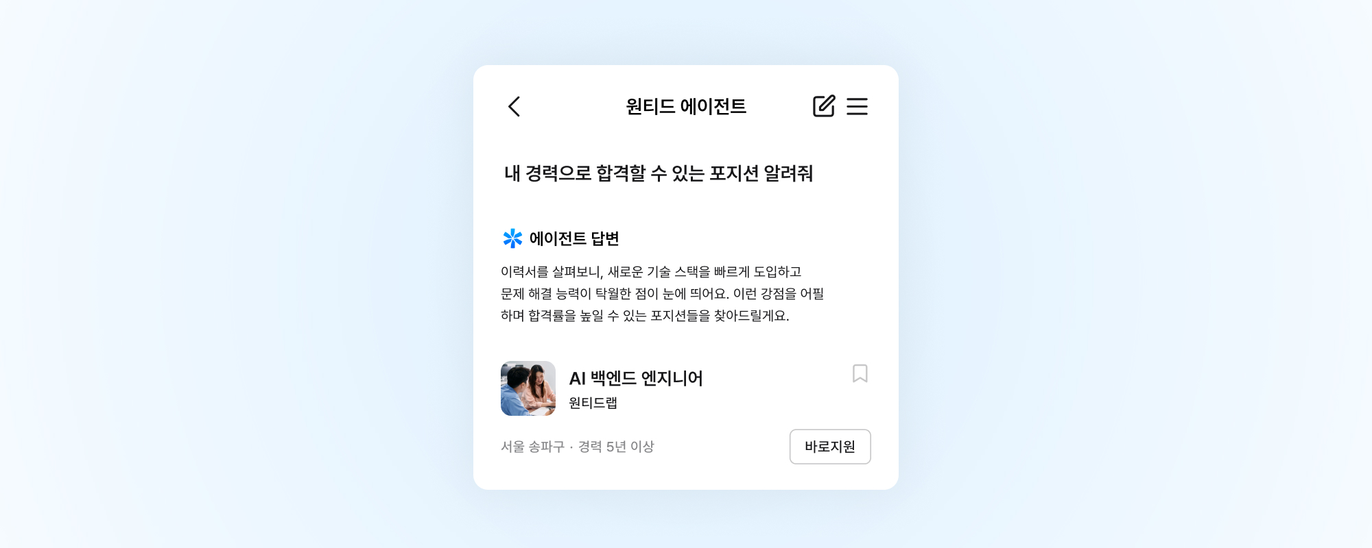 지금 바로 접속하여 원티드 에이전트 기능을 사용해 보세요! 여러분의 커리어 목표에 한 발짝 더 다가서시길 원티드가 응원합니다.